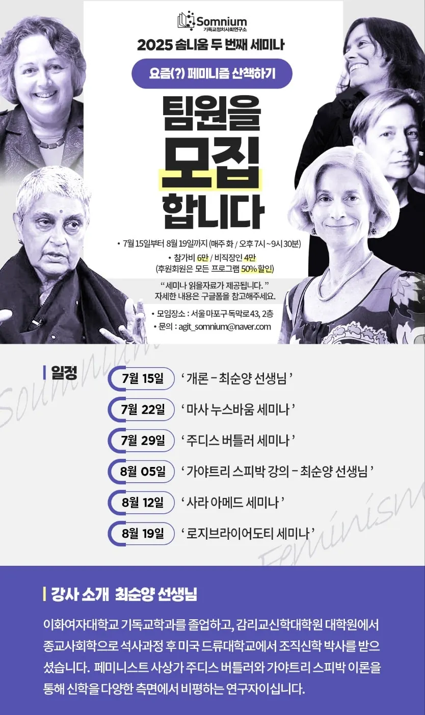 Somnium_기독교정치사회연구소에서 진행하는 <요즘(?) 페미니즘 산책하기> 신청양식입니다. 세미나는 온라인(줌)-오프라인으로 함께 진행됩니다.