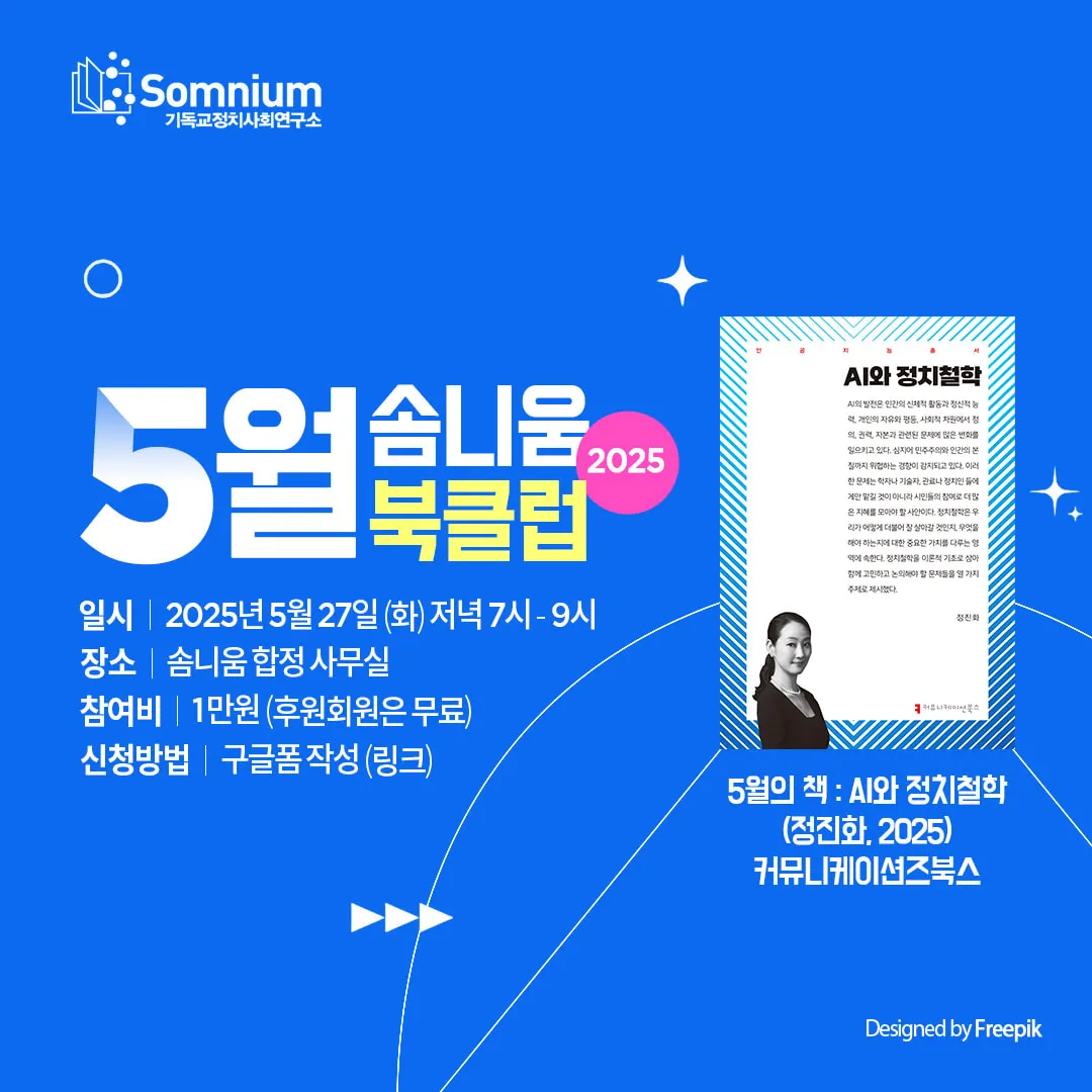 5월 북클럽에서 함께 읽을 책은 "정진화, 『AI와 정치철학』"입니다. AI는 우리의 삶을 새롭게 바꿔줄 기술일까요, 아니면 새로운 정치적 질서일까요? 『AI와 정치철학』은 자유, 평등, 정의의 의미를 정치철학적 관점에서 다시 풀어내며, 권력과 자본, 인간과 기계의 경계, 그리고 민주주의와의 관계를 함께 질문하게 만듭니다.