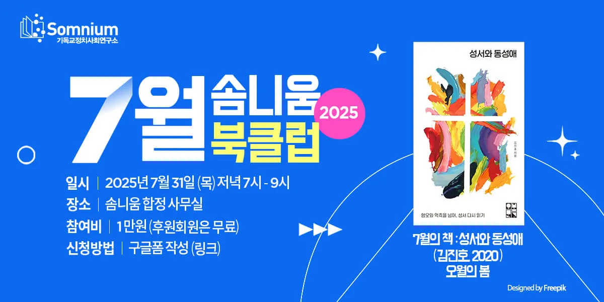 솜니움 7월 북클럽에서는 『성서와 동성애: 혐오와 억측을 넘어, 성서 다시 읽기』(김진호)를 함께 읽습니다. 책의 저자인 김진호는 성서학연구자이자 민중신학자이자, 한국교회의 대형화, 극우화 현상을 오랫동안 연구하였습니다.