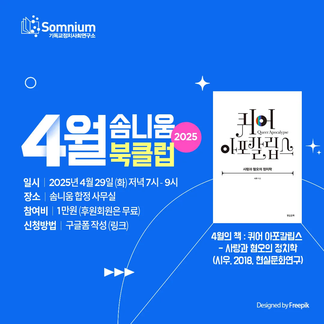 4월 독서와 북클럽을 통해 동성애 혐오 운동의 핵심인 보수 개신교회의 정치적 실천을 분석해보려 합니다. 나아가 퀴어 대 반퀴어라는 대립구도를 넘어 다양한 정체성을 긍정하는 미래의 정치학이 무엇인지 사유합니다.